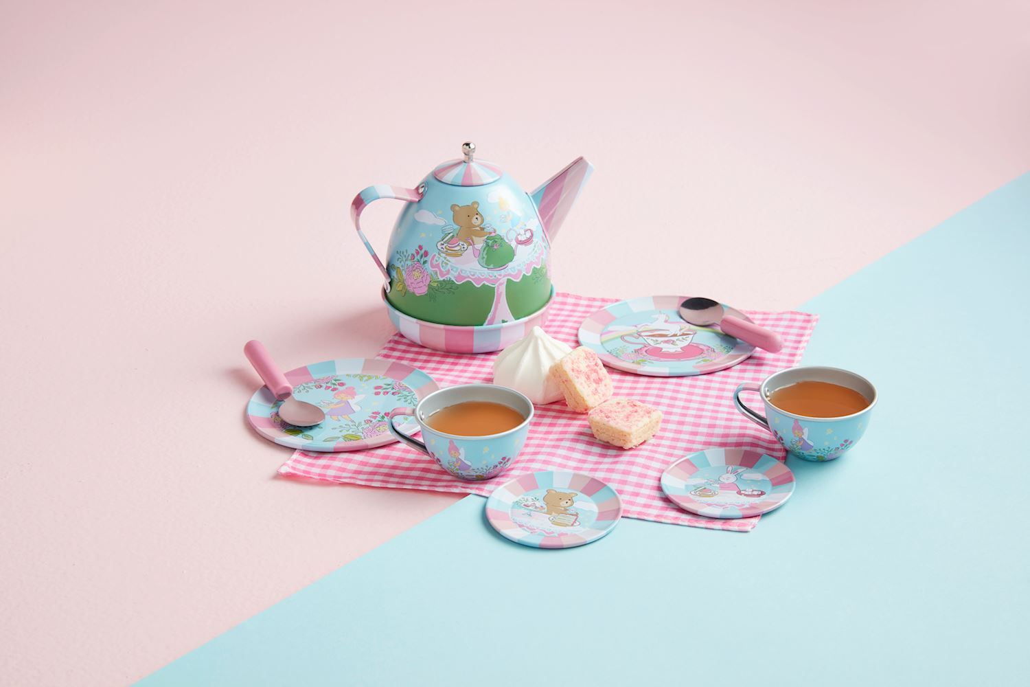 The Musical Fairy Tea Set is a delightful 9-piece tin tea party set that is perfect for any little tea party enthusiast. This charming set includes a wind-up musical tea pot that plays a sweet tune, adding an extra element of fun to tea time. In addition to the musical tea pot, the set also includes two cups, two saucers, two plates, and two spoons, all adorned with whimsical fairy designs. The set is completed with a lovely tablecloth to set the stage for a magical tea party. Made of durable tin, this tea set is not only adorable but also built to last. Whether hosting a tea party for friends or simply enjoying a pretend tea time, the Musical Fairy Tea Set is sure to bring joy and imagination to any playtime.