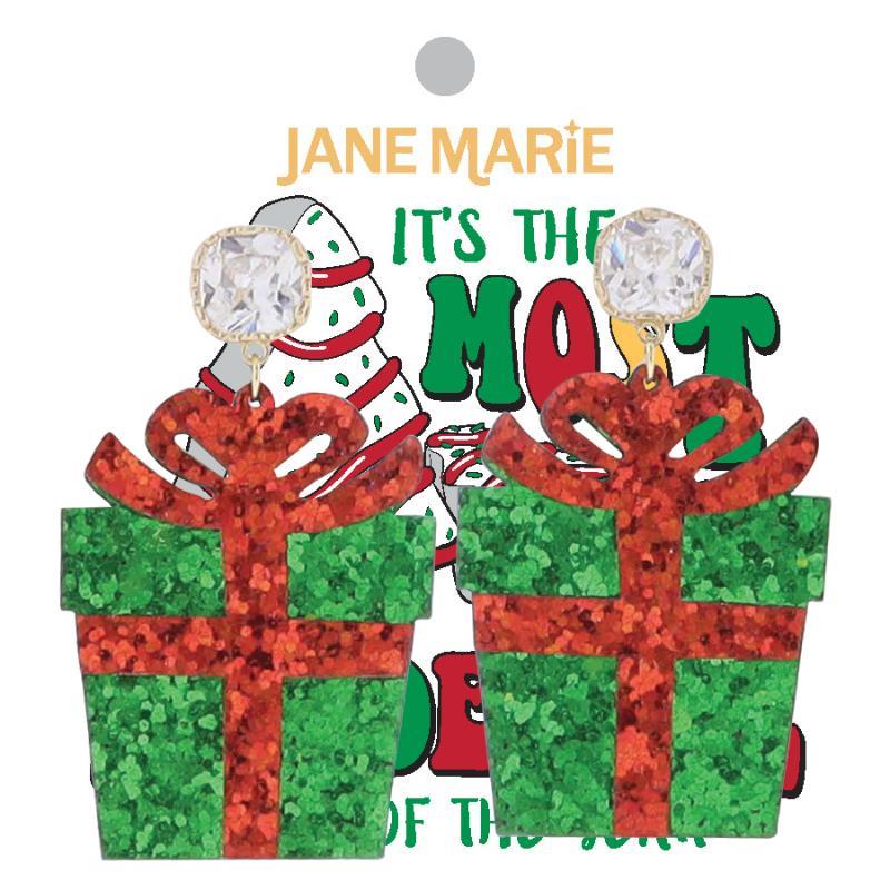 Red, Green Glitter Present with Clear Square Crystal Post Earring