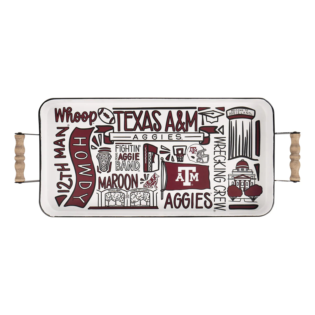 Serve up your favorite gameday snacks in style with this Texas A&M Collage Enamel Tray that is perfect for serving food, organizing items, or displaying your team spirit! With sights, sounds, and symbols of the iconic university, this metal tray with wooden handles is decked out in pride for Texas A&M Aggies! It makes the perfect gift for any fan, alumni, student, or faculty!
